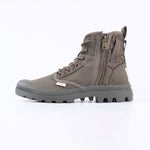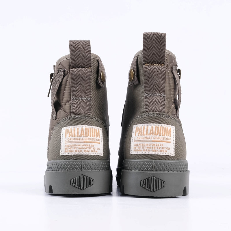 The Palladium Pampa Detroit Slip Boots in Olive Night offer a rugged military-inspired design with durable canvas and quilted details. Featuring a side zipper for easy slip-on wear and chunky tread soles they combine practicality with street-ready style.