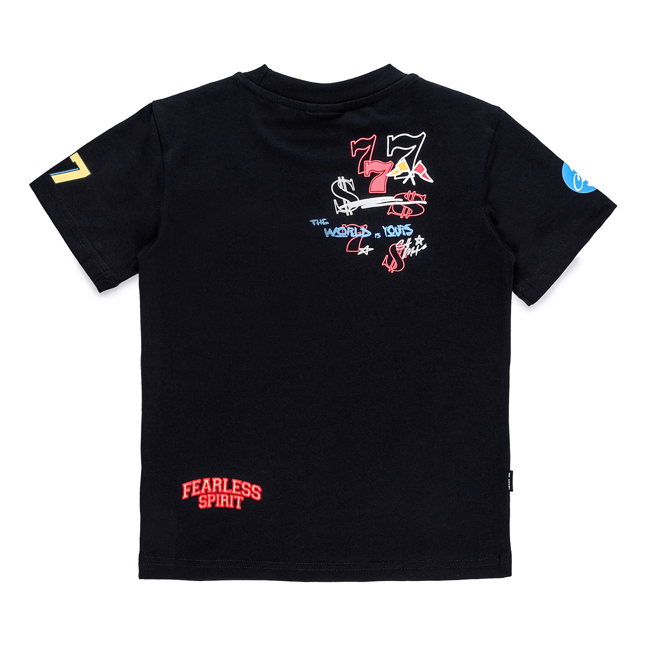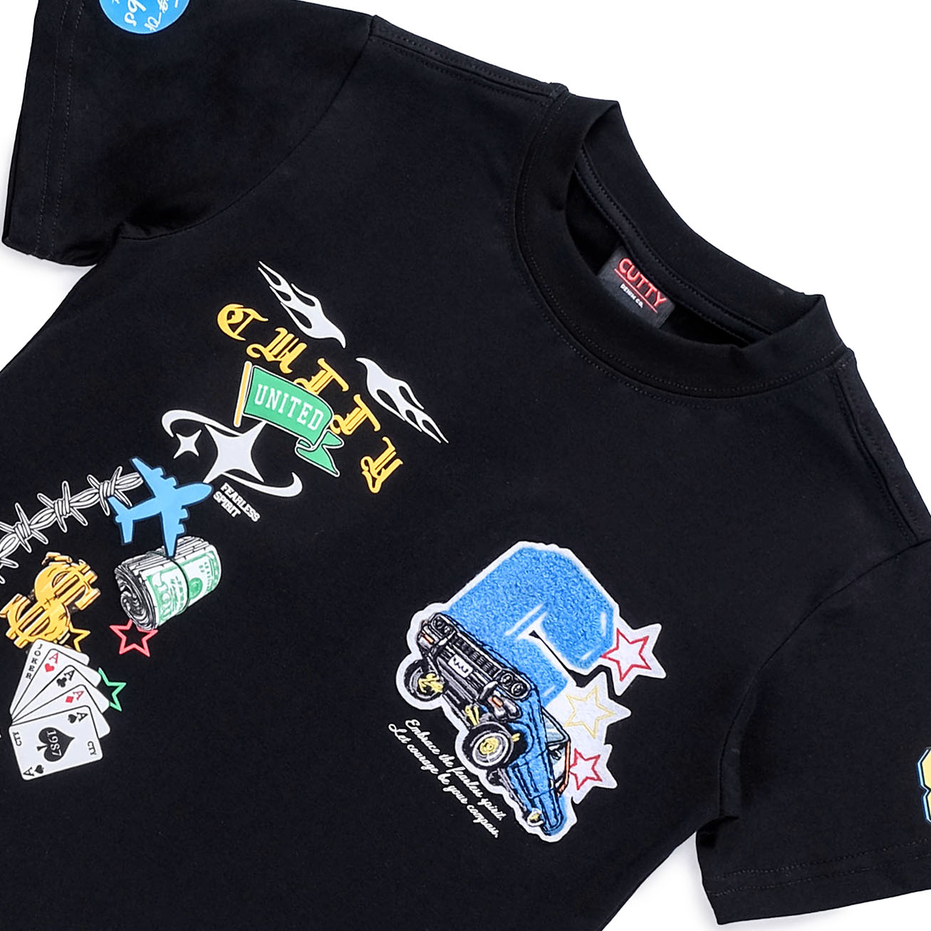 The Cutty Denim Co. Prost B Kids T-Shirt in black features bold front and back graphics inspired by street culture symbols like dice cars cash and flames. With playful pops of colour and textured patches this tee brings fearless energy to everyday fits.