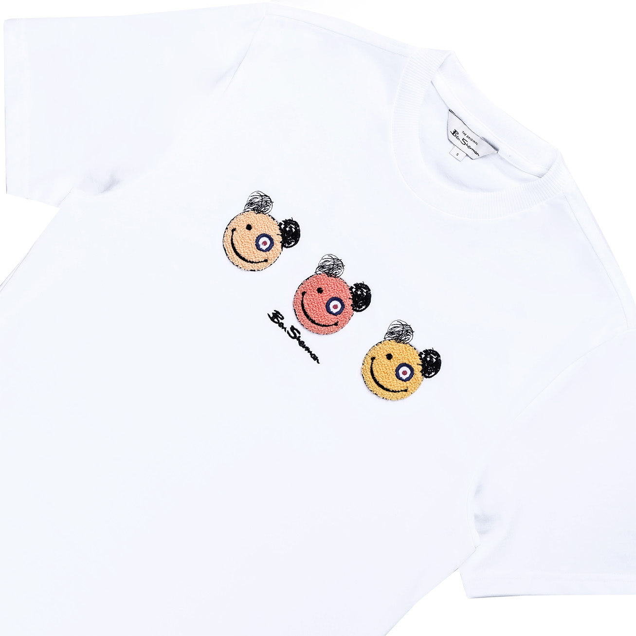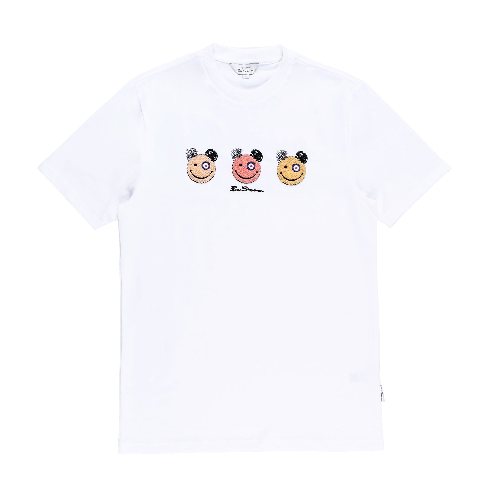 By Ben ShermanThe Ben Sherman Happy Bears Crew T-Shirt in white showcases three colorful bear face graphics across the chest. Playful and casual it adds a cheerful edge to any streetwear fit.