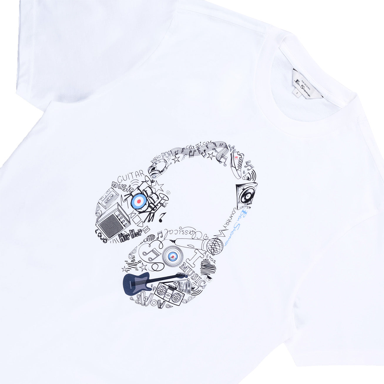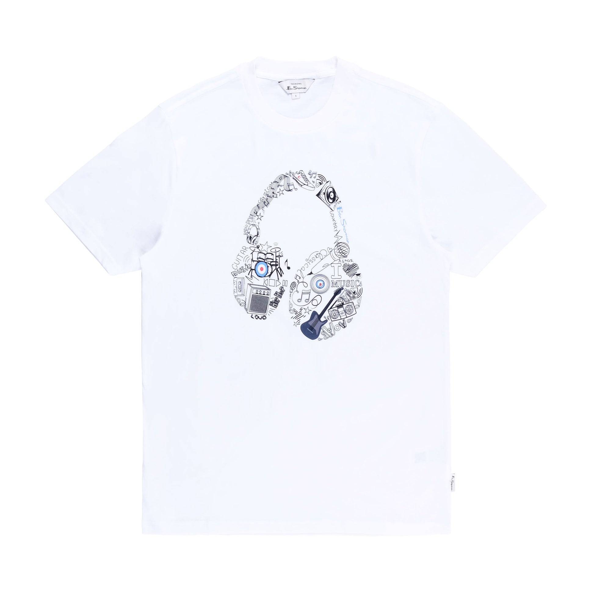 By Ben ShermanThe Ben Sherman Typography Headphones Crew T-Shirt stands out with a creative headphone graphic made from music inspired doodles and symbols. Its crisp white base and relaxed crew fit bring a fresh artistic energy to everyday style.