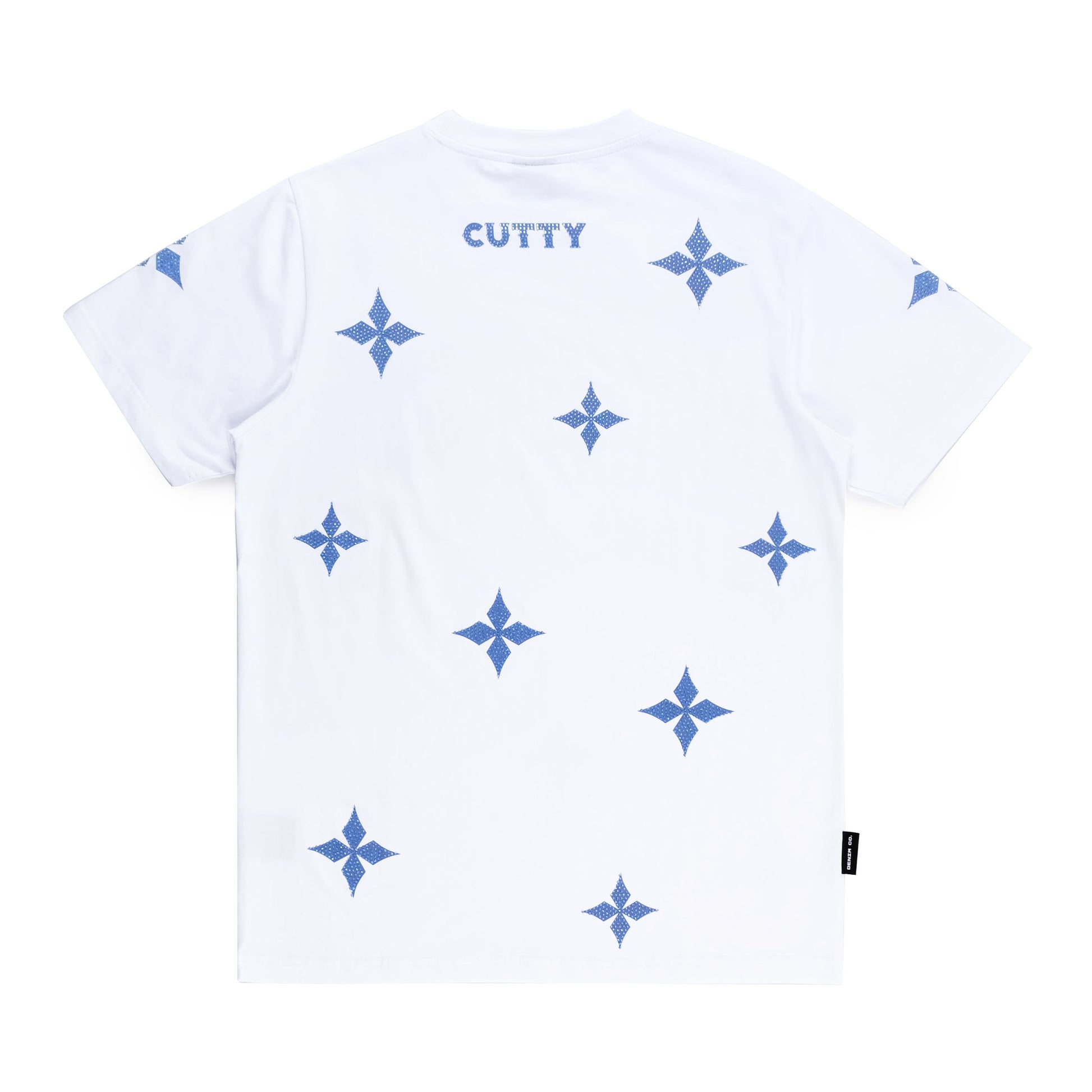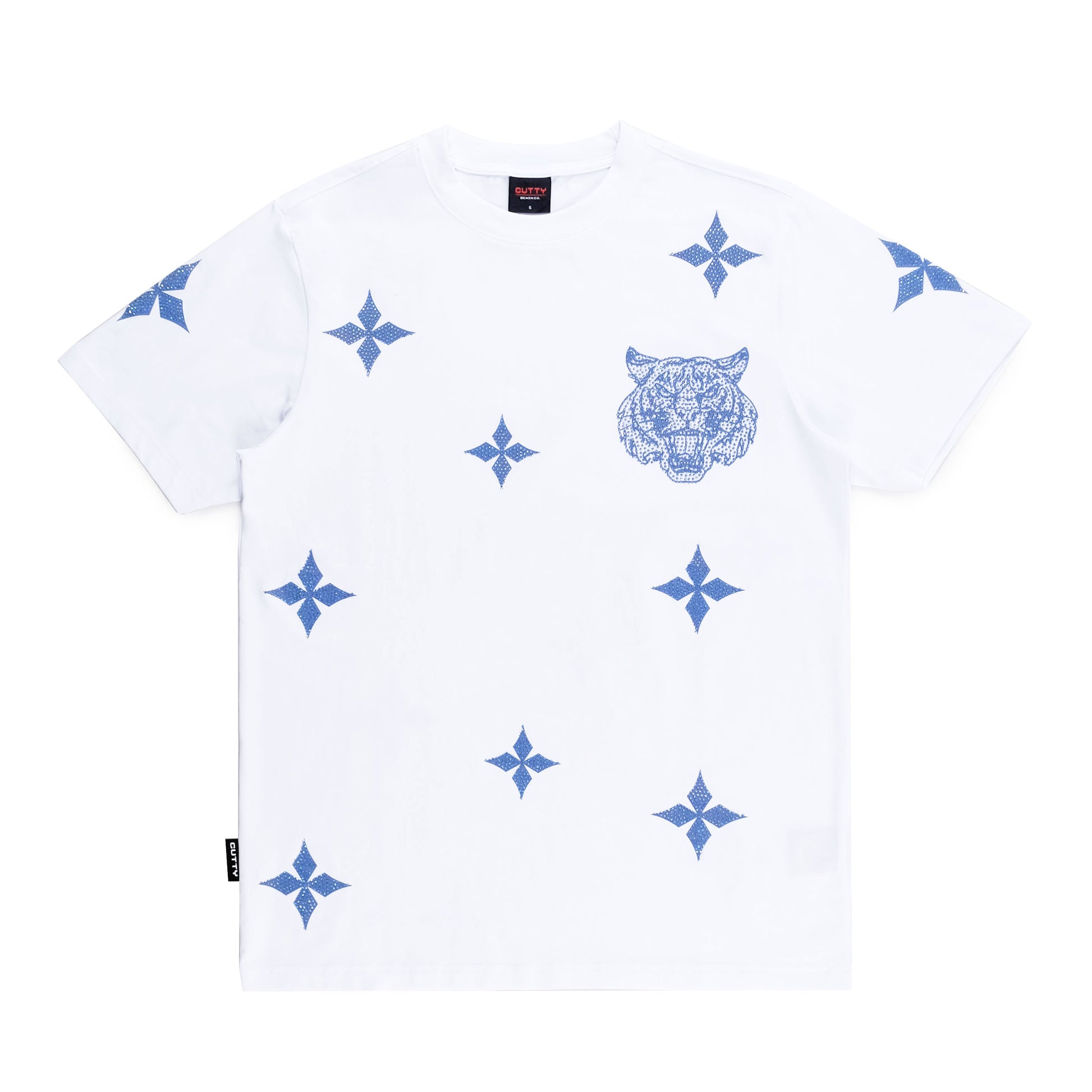 This Cutty Denim Co. bold tee features striking blue tiger and star motifs across a crisp white base for standout style. Crafted for comfort and confidence this piece brings fearless energy to any fit.