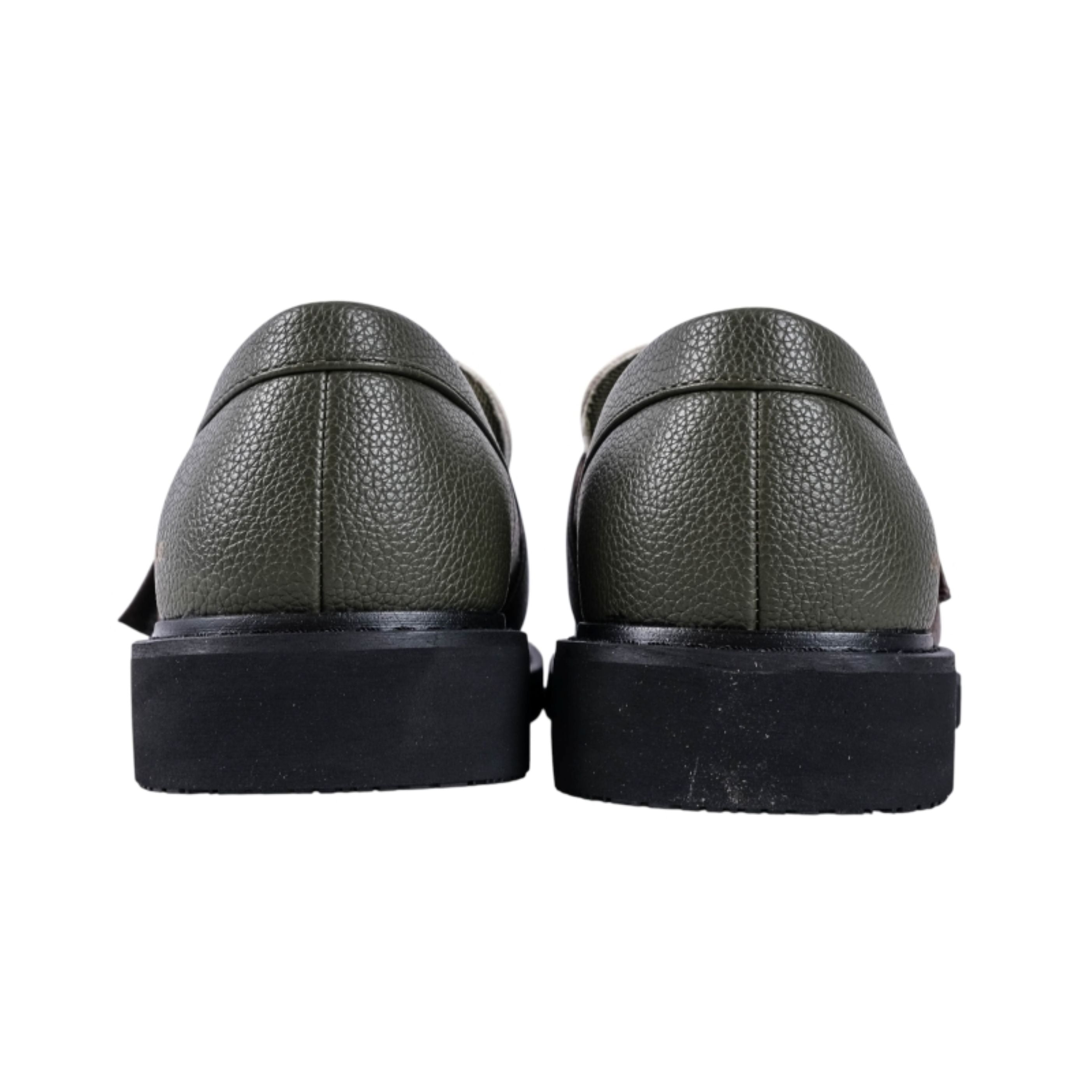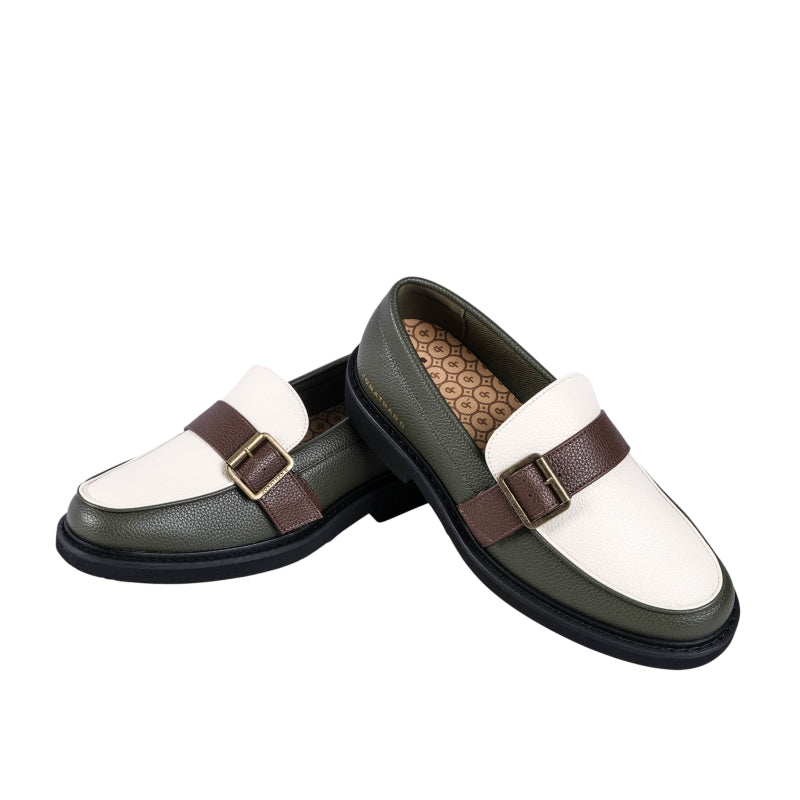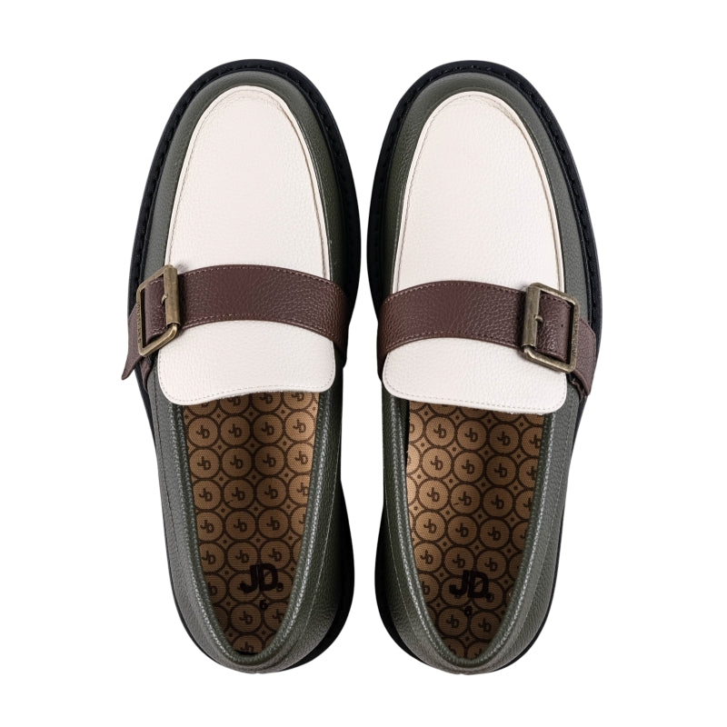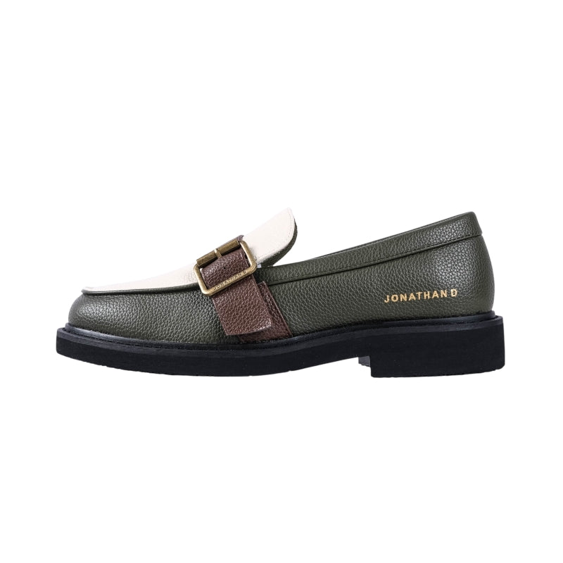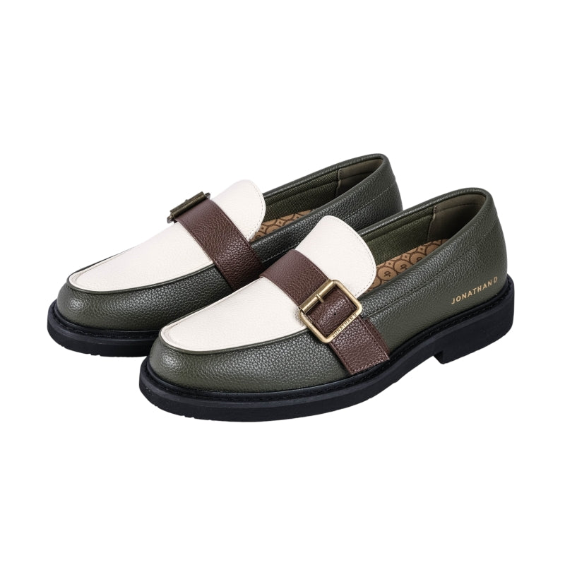 The Jonathan D Mickey Loafers deliver bold contrast with a refined finish. Featuring a textured olive upper with a crisp white panel and statement buckle strap they bring modern edge to classic styling. Set on a sturdy black sole this pair is built for standout smart casual looks.