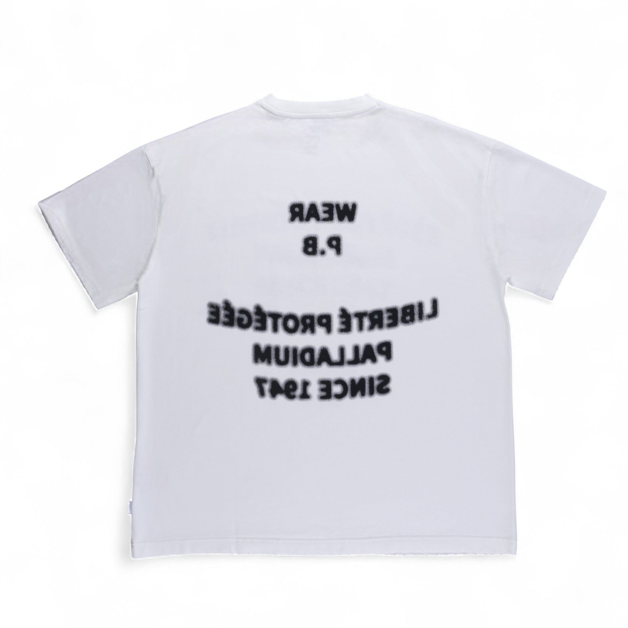 By PalladiumThe Palladium Liberte Protege Distressed T-Shirt features a bold spray-effect print on crisp white cotton for a standout streetwear look. Its relaxed fit and reversed lettering add a creative edge to a clean minimalist design.