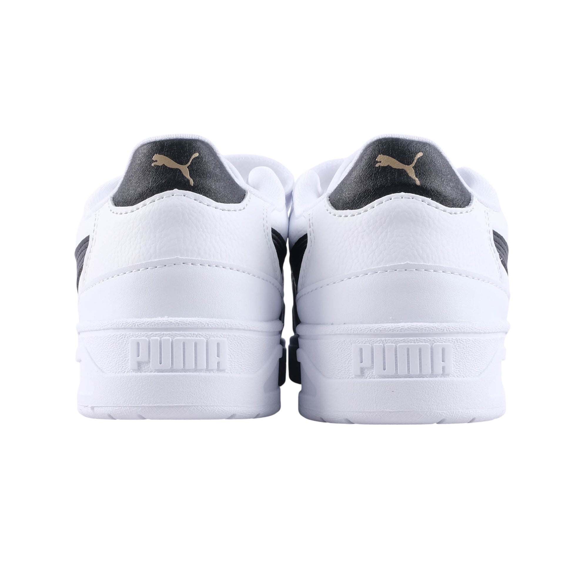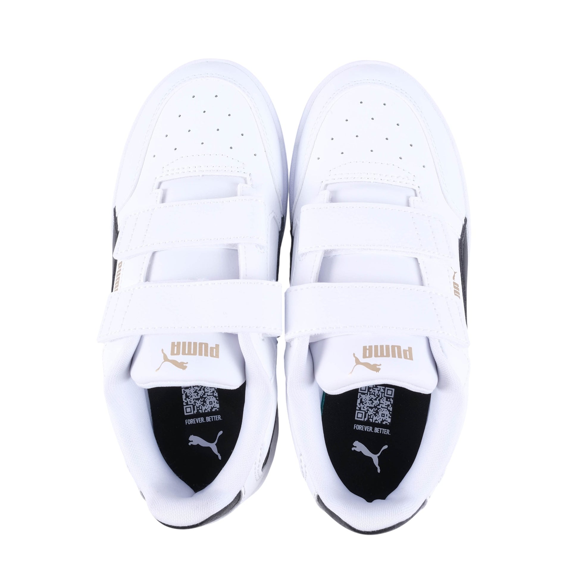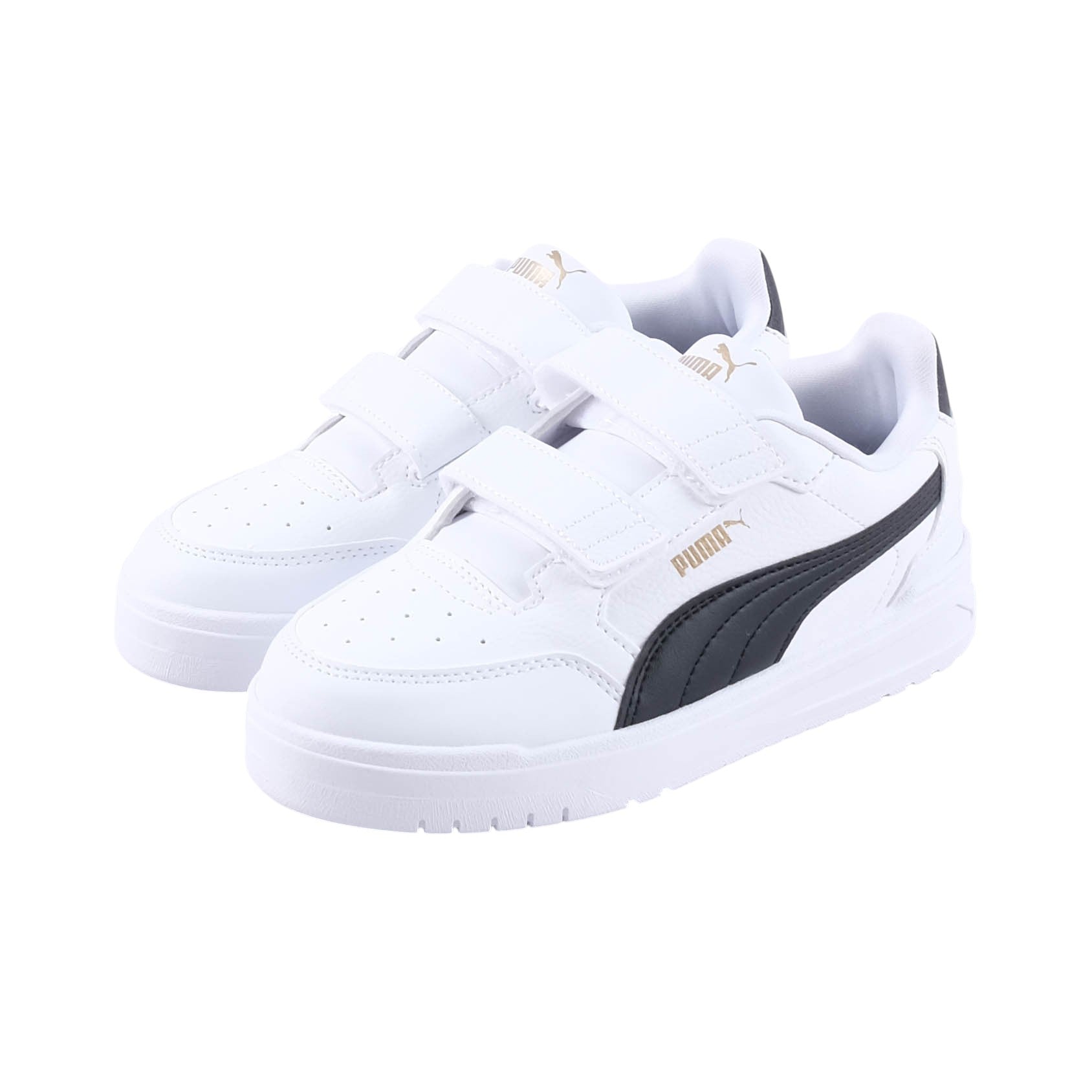 The Puma Shuffle Downtown Kids Sneakers combine clean white leather with bold black detailing for a classic everyday look. Easy Velcro straps make them simple to slip on while the cushioned sole keeps every step light and comfortable.
