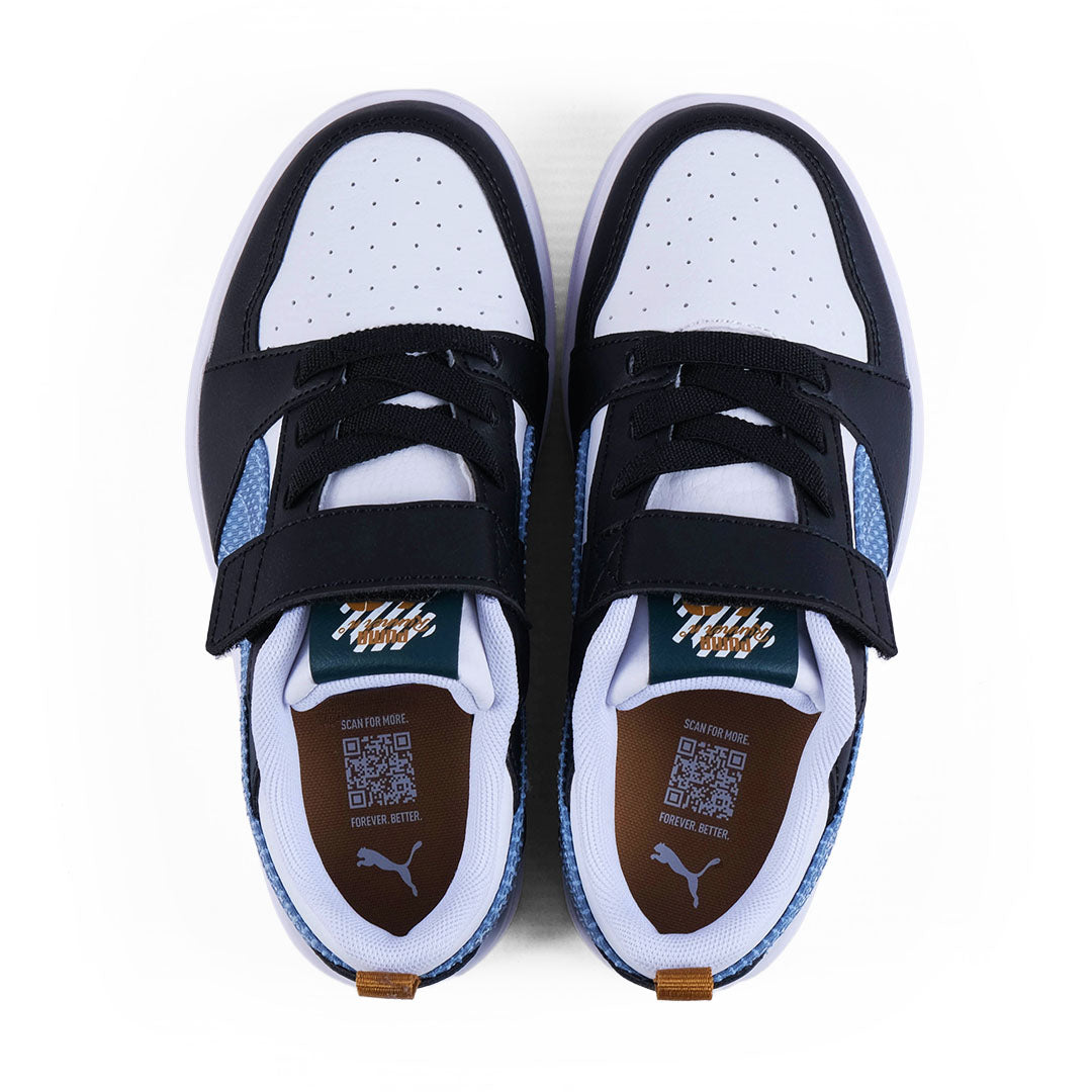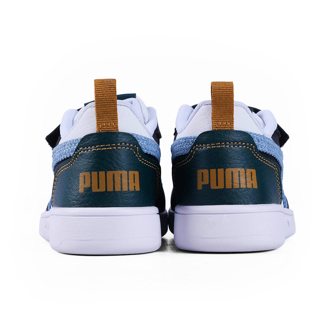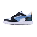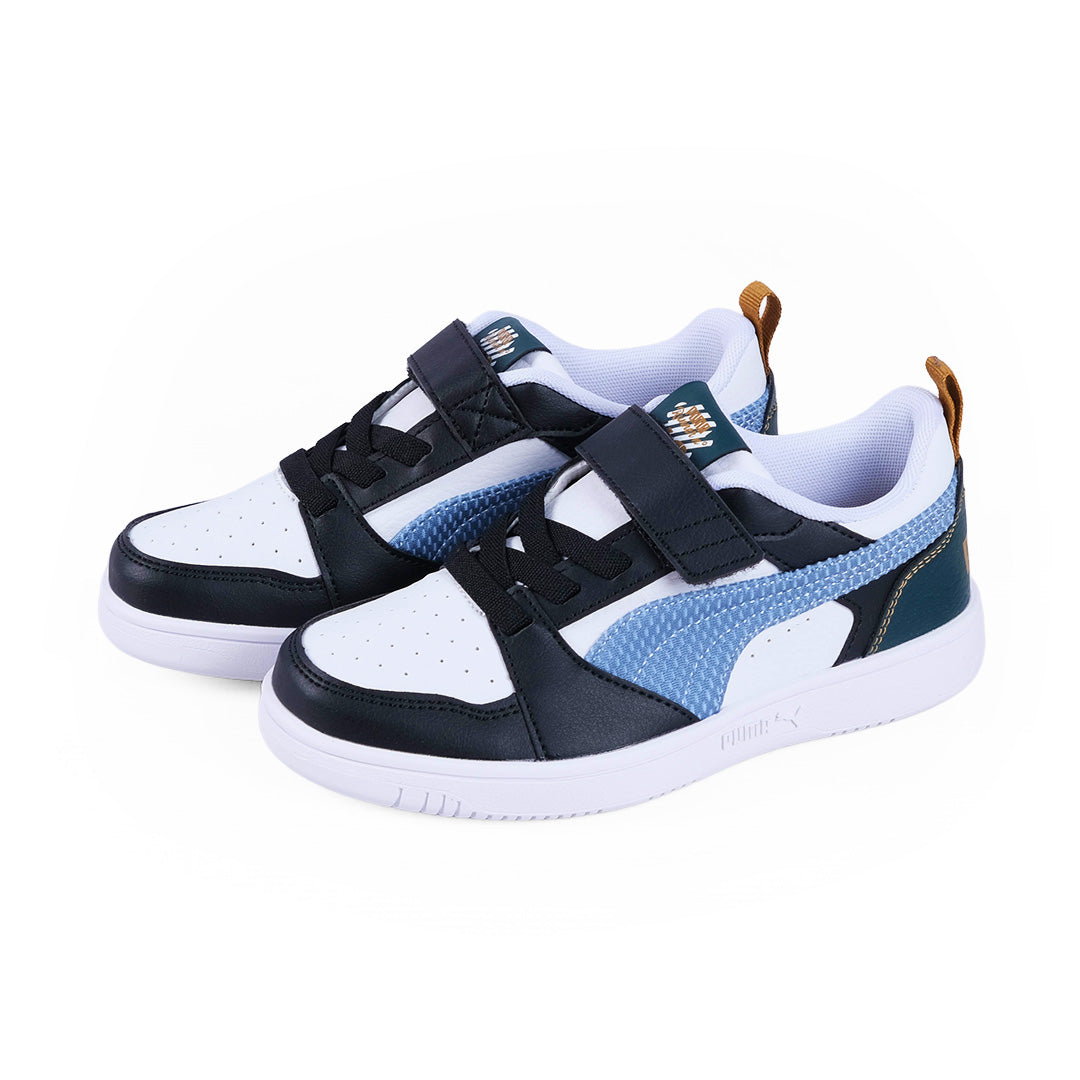 The Puma Rebound V6 Kids Sneakers bring playful energy with a mix of soft blue and bold black overlays on a crisp white base. Designed for all day comfort they feature easy strap fastening and durable soles for active adventures.