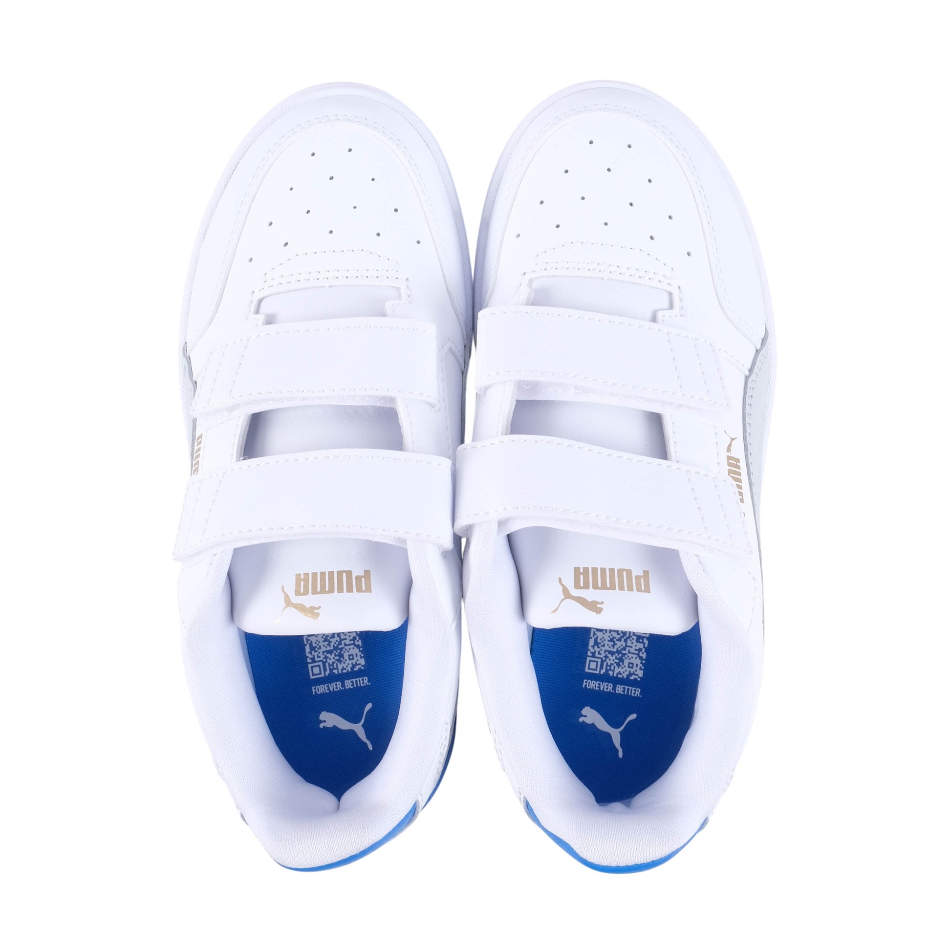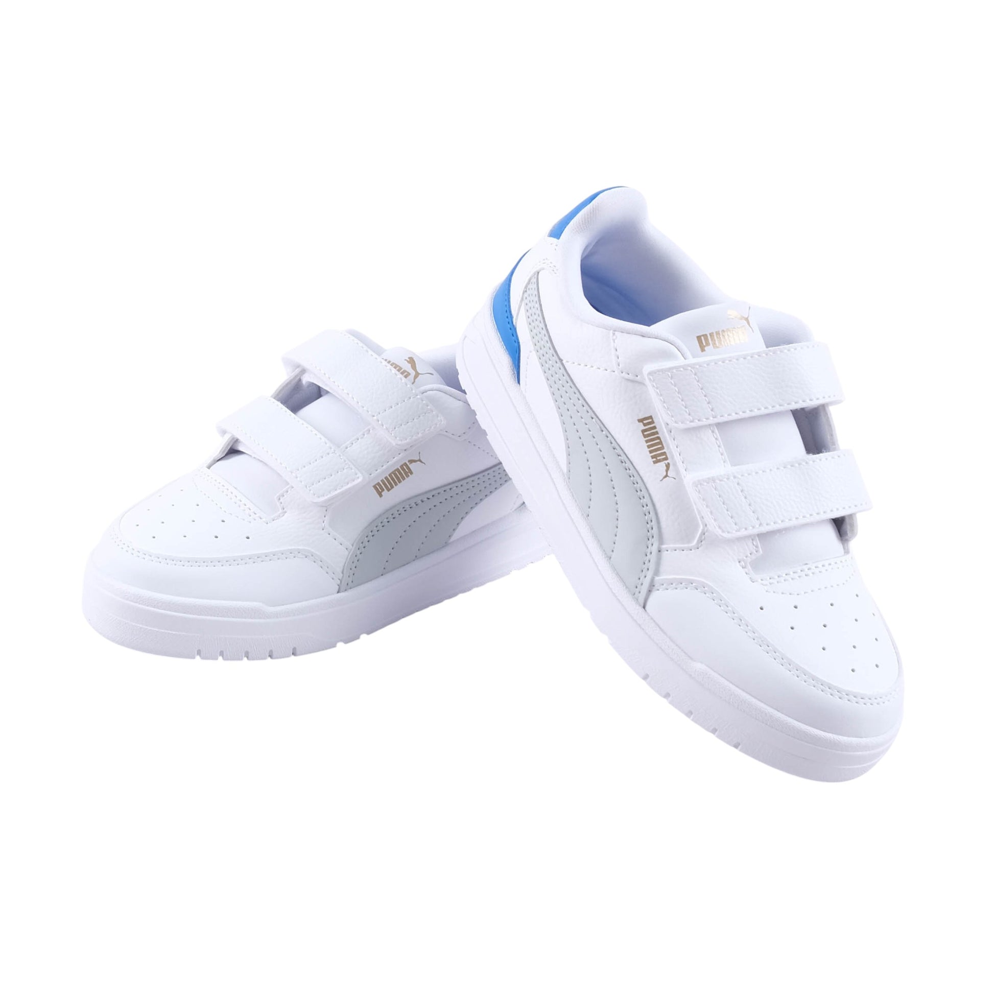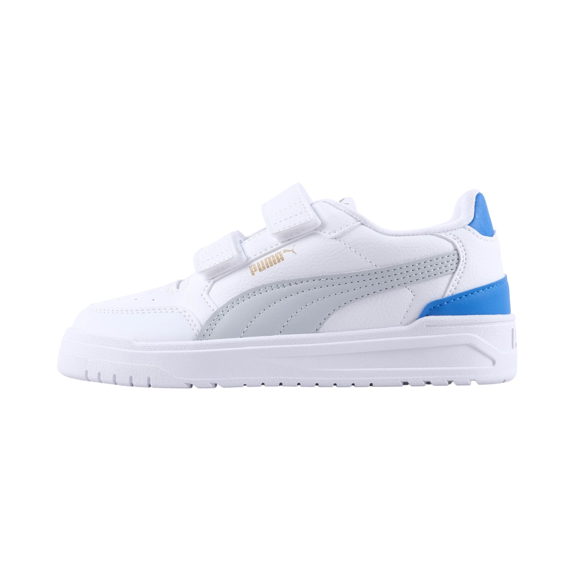 The Puma Shuffle Downtown Kids Sneakers feature a clean white base with soft grey accents and a pop of blue at the heel for a sporty finish. Their Velcro straps make them easy to wear while the cushioned sole ensures comfort for every adventure.