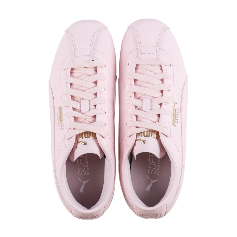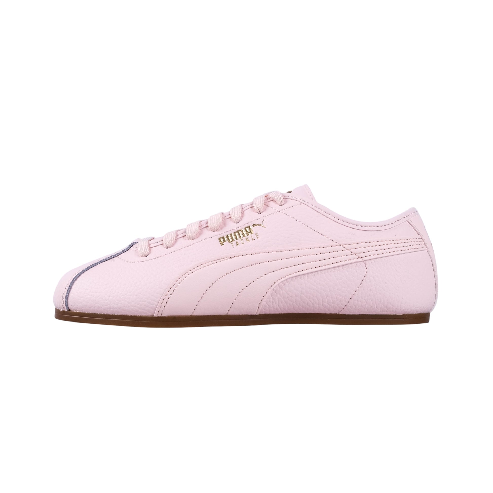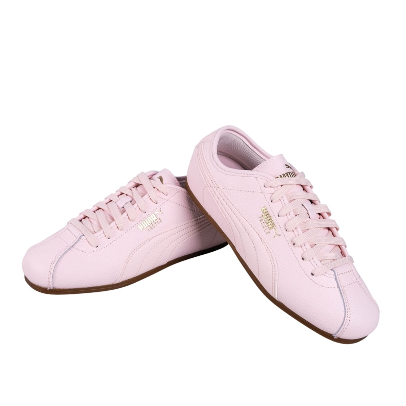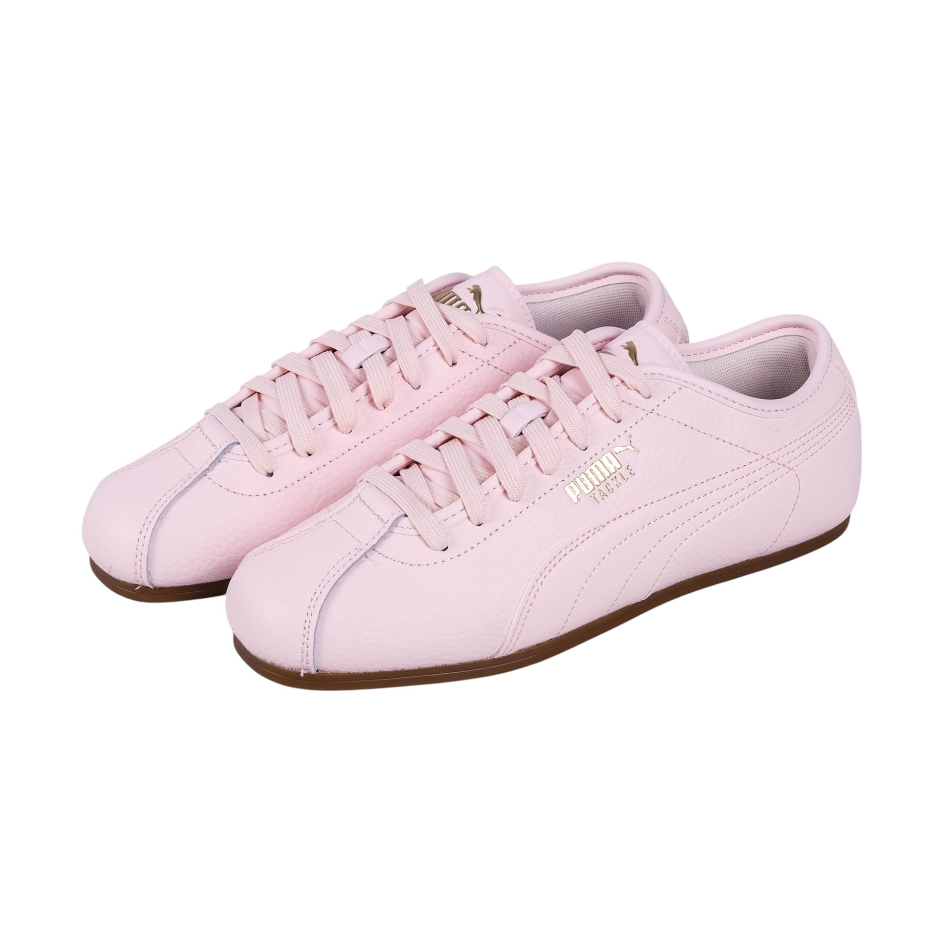 Puma Tackle Sneakers deliver a sleek low profile silhouette in a soft pastel pink finish. The smooth leather upper is accented with subtle stitching and gold Puma branding for a refined feminine touch. Set on a slim gum sole these sneakers bring effortless everyday style with a sporty edge.