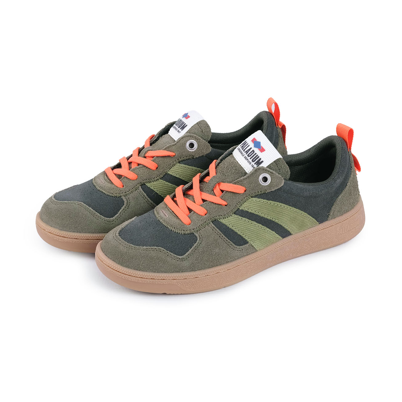 The Palladium Pallacup Flame Sneakers showcase a rugged mix of green suede and canvas with striking orange laces and pull tabs. Their gum sole adds durability while the bold design makes them a standout for casual streetwear looks.