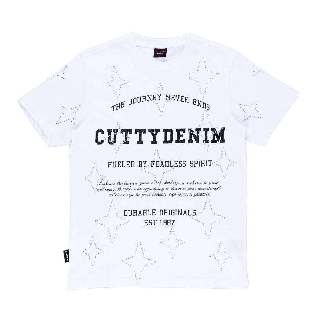By Cutty Denim CoThe Reece Crew T Shirt from Cutty Denim Co makes a bold statement with its star stud pattern and classic streetwear fit. Featuring fearless text graphics and Cutty branding this piece is made to stand out in any crowd.