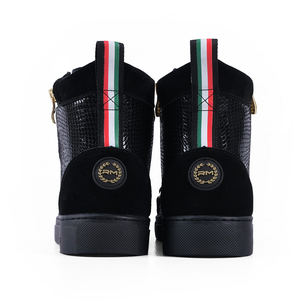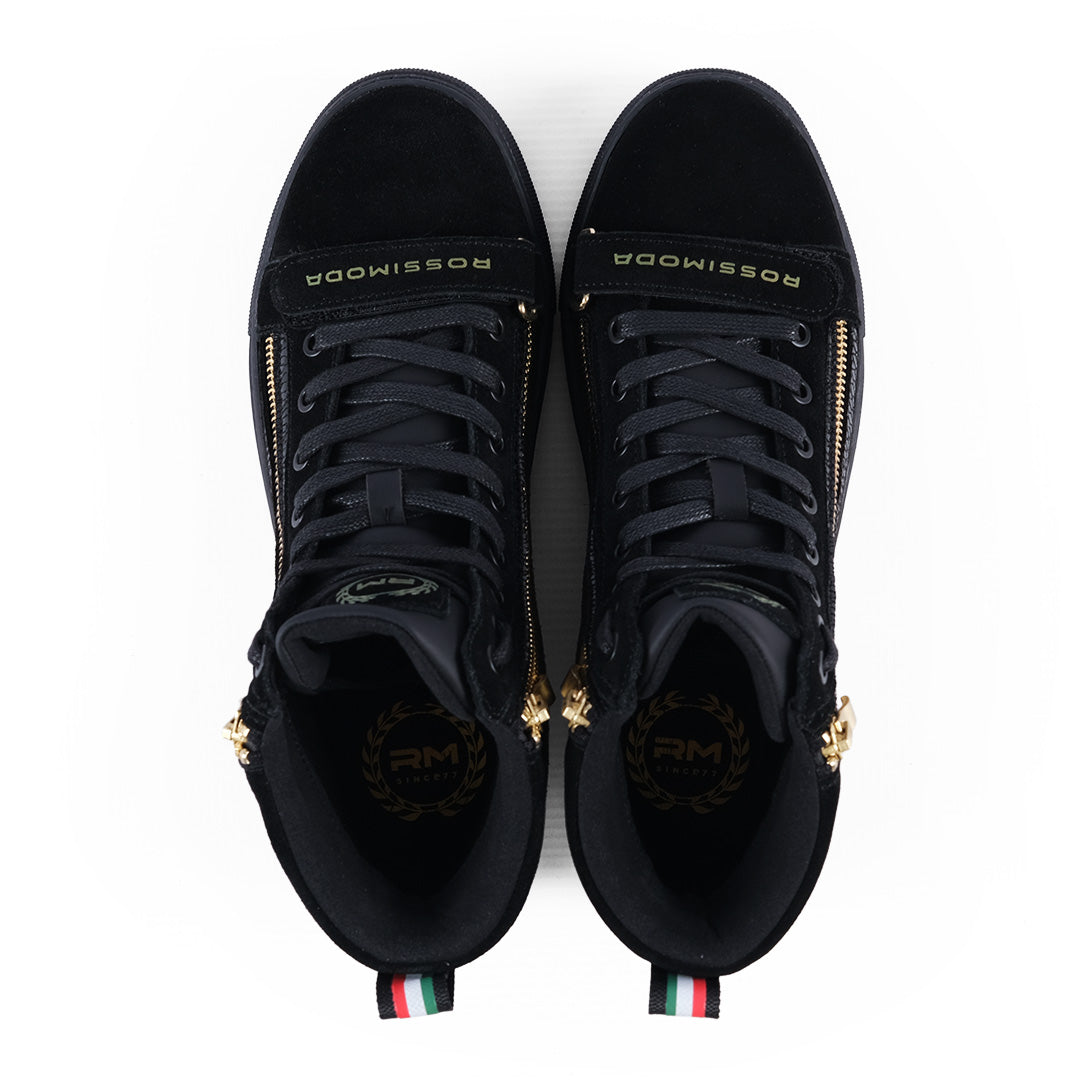 The Rossimoda Alta Sneakers bring a luxury edge with black suede and textured leather panels accented by bold gold zips. Italian flag heel tabs and premium detailing make them a standout streetwear statement.