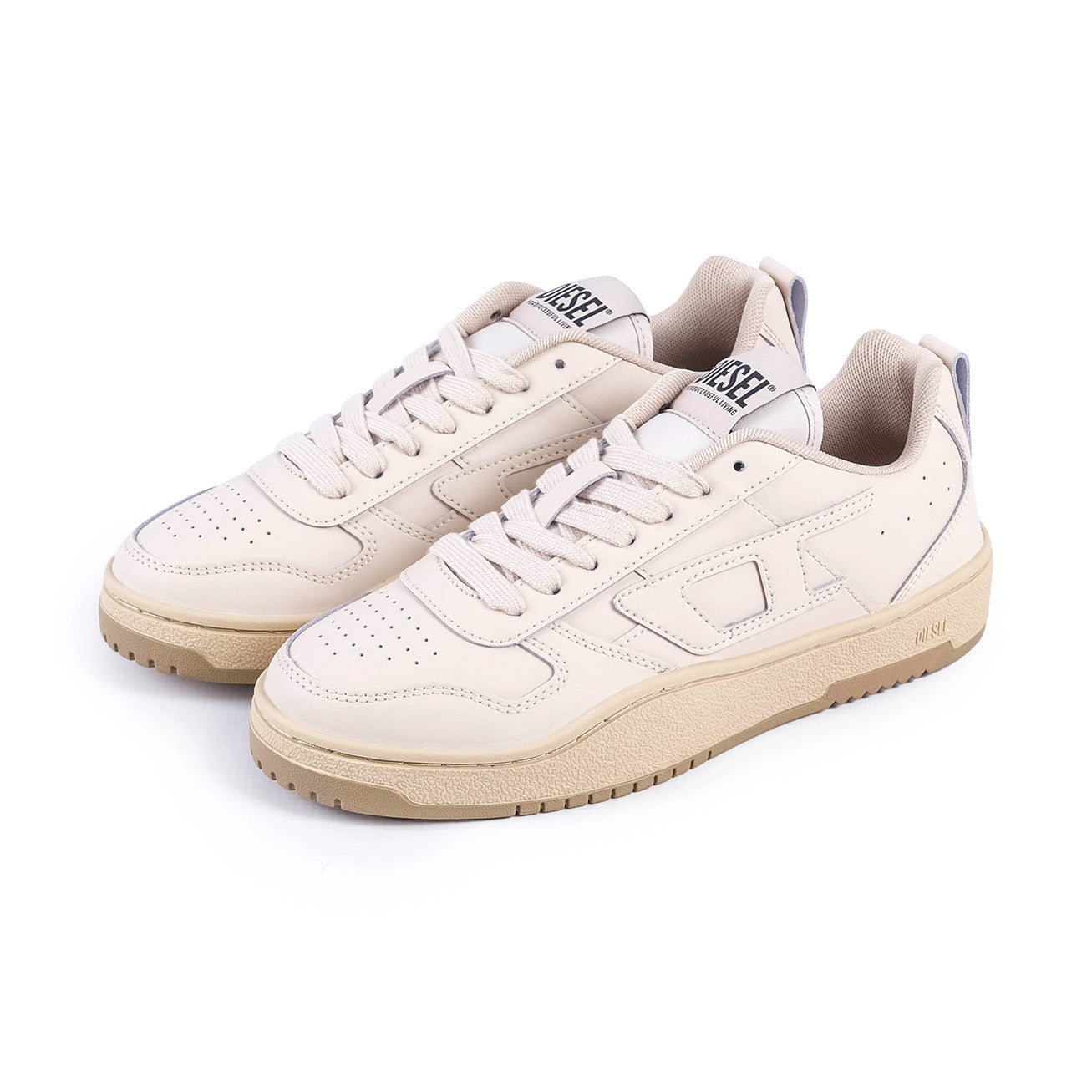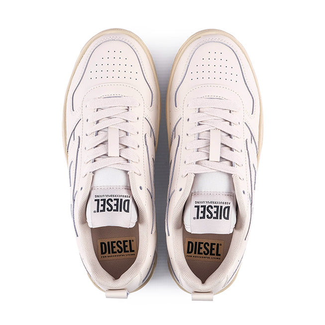 The Diesel S-Ukiyo V2 Low Sneakers offer a sleek minimalist look with a smooth cream upper and tonal stitching. A textured beige sole adds contrast and durability making them perfect for everyday wear.