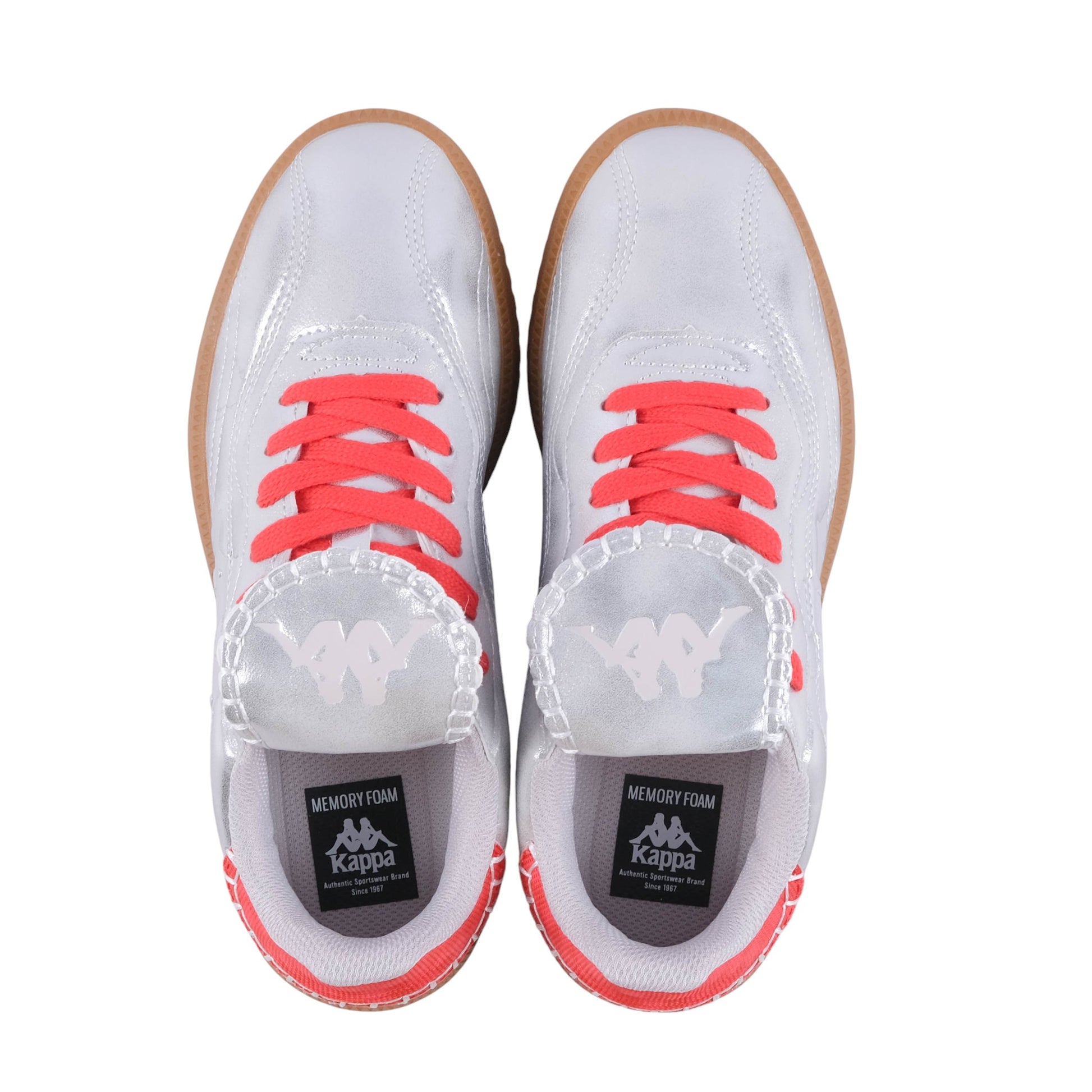 The Kappa Jules 1 Ladies Sneakers bring a futuristic twist to classic streetwear with their silver finish and bold coral laces. A gum sole and cushioned memory foam footbed ensure comfort that matches their standout style.