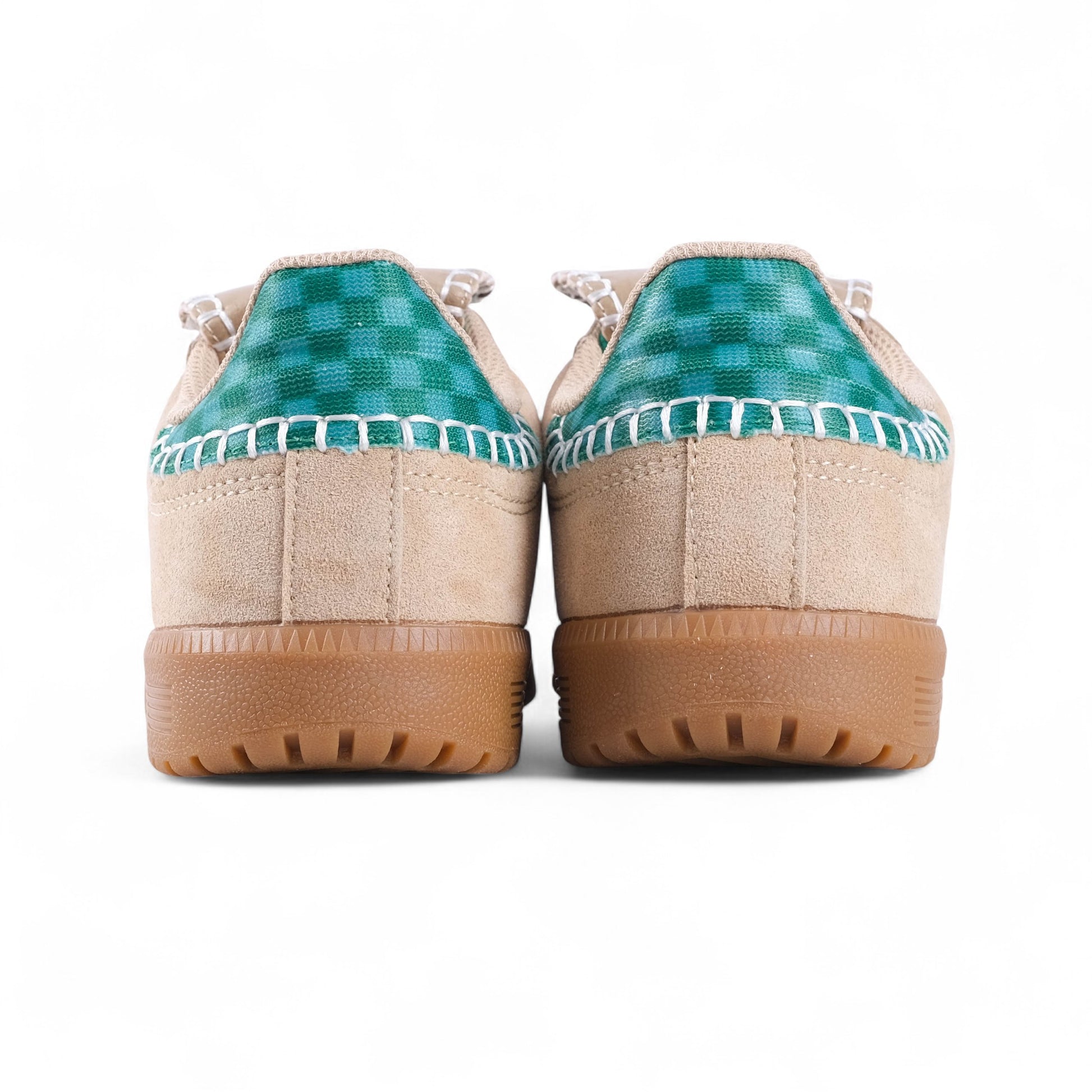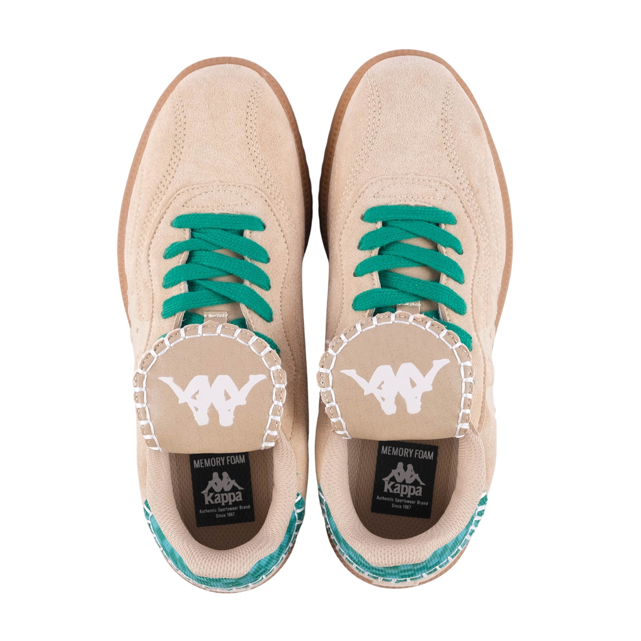 The Kappa Jules 1 Ladies Sneakers feature a beige suede upper with bold green laces and a gum sole for everyday comfort. A checkered heel detail and signature logo patch add a playful twist to this casual streetwear staple.