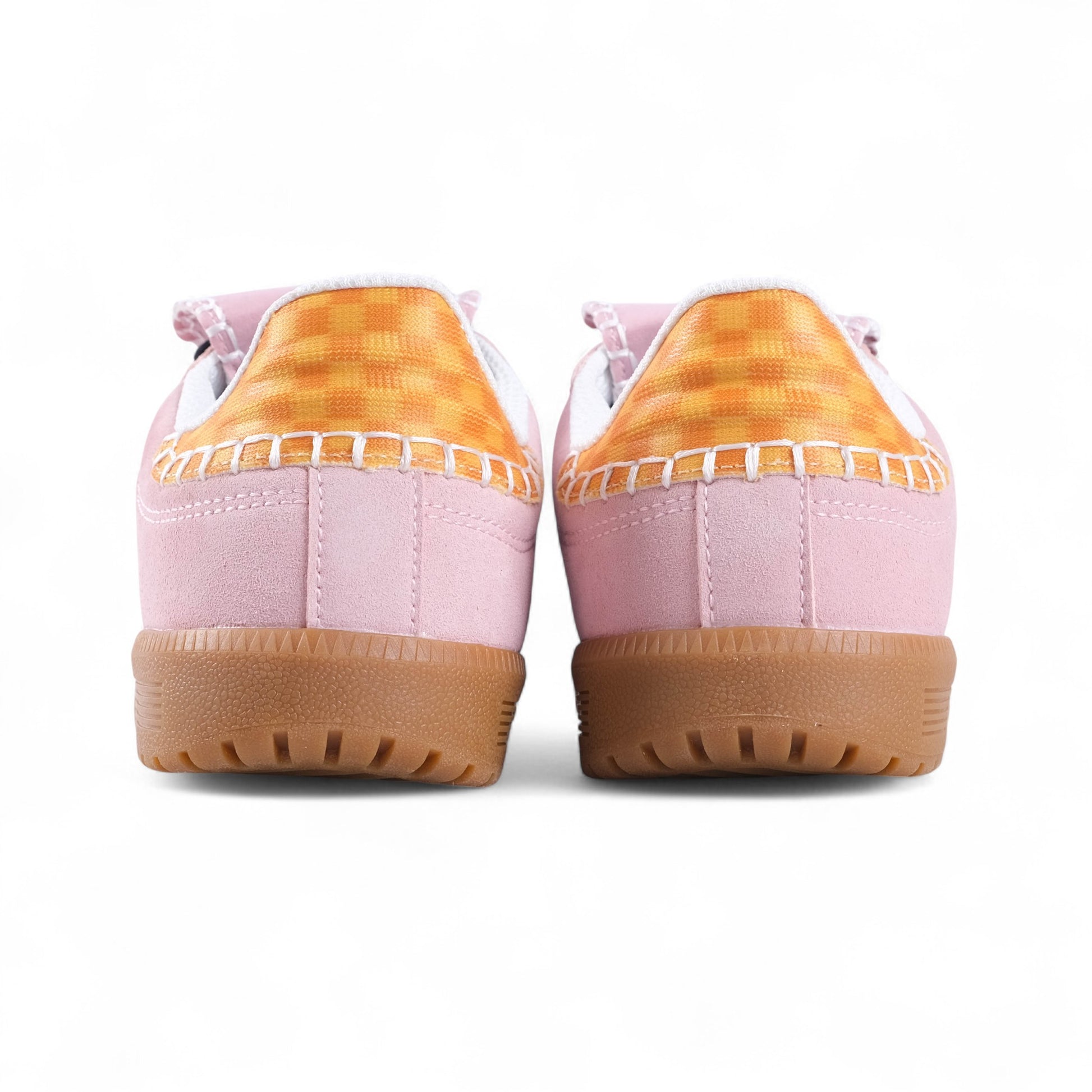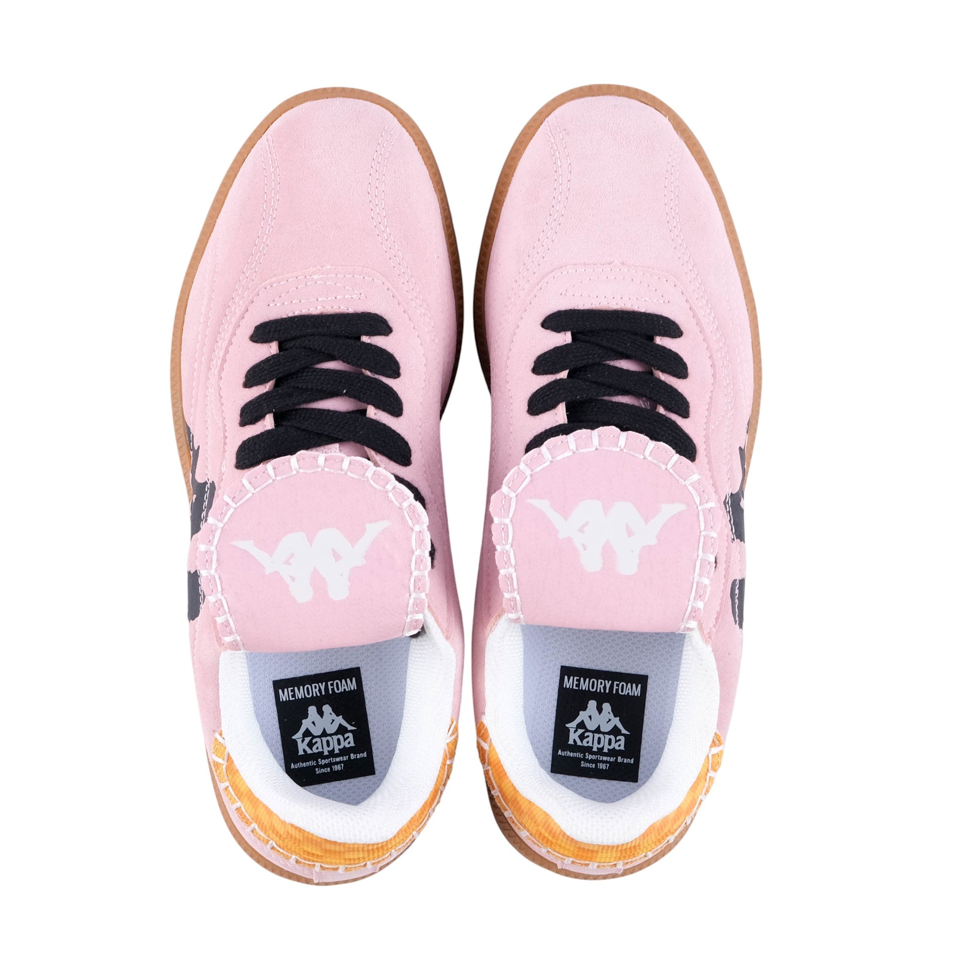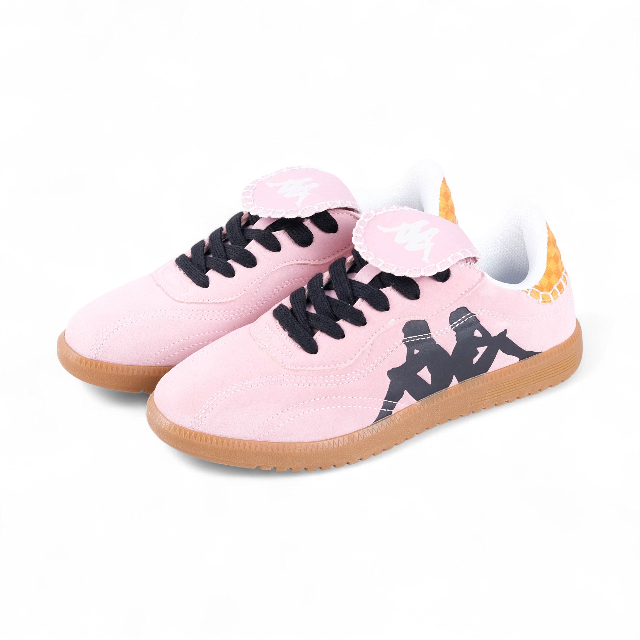 The Kappa Jules 1 Ladies Sneakers showcase a soft pink upper with bold black logo detailing for a confident streetwear edge. Finished with orange checkered heel panels and a cushioned gum sole they deliver both flair and all-day comfort.