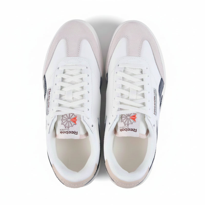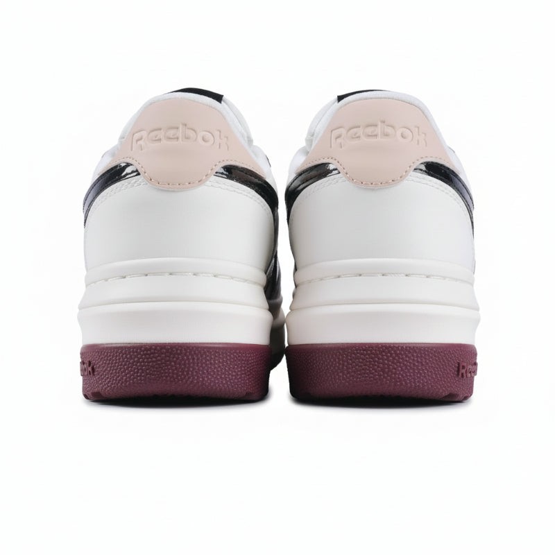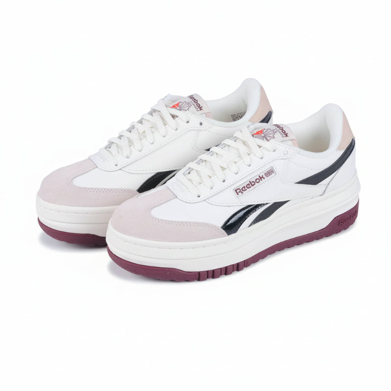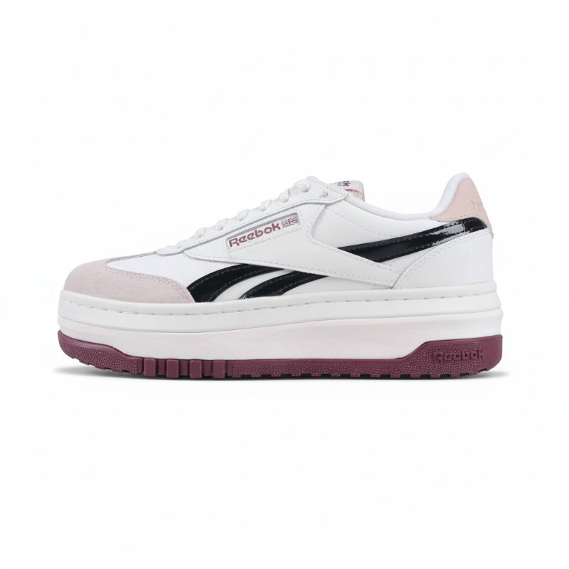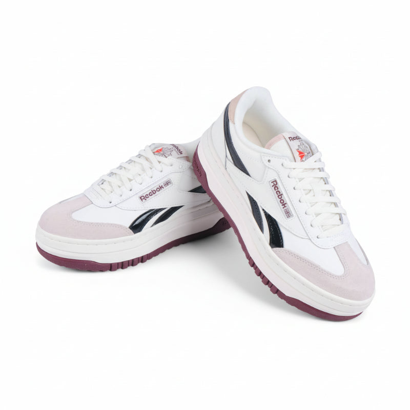 The Reebok Campio Extra Sneakers feature a modern platform design that blends sporty style with everyday comfort. The crisp white upper with soft blush accents and a deep plum sole adds a bold touch to any casual look.