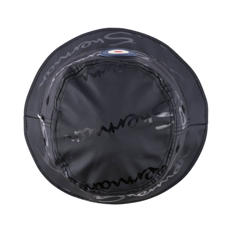 Ben Sherman Plastisol Bucket Hat makes a bold statement with an all over script print and signature target badge at the front. The classic bucket silhouette delivers easy street style with lightweight comfort. Finished in a sleek dark tone this hat levels up any casual rotation with standout attitude.