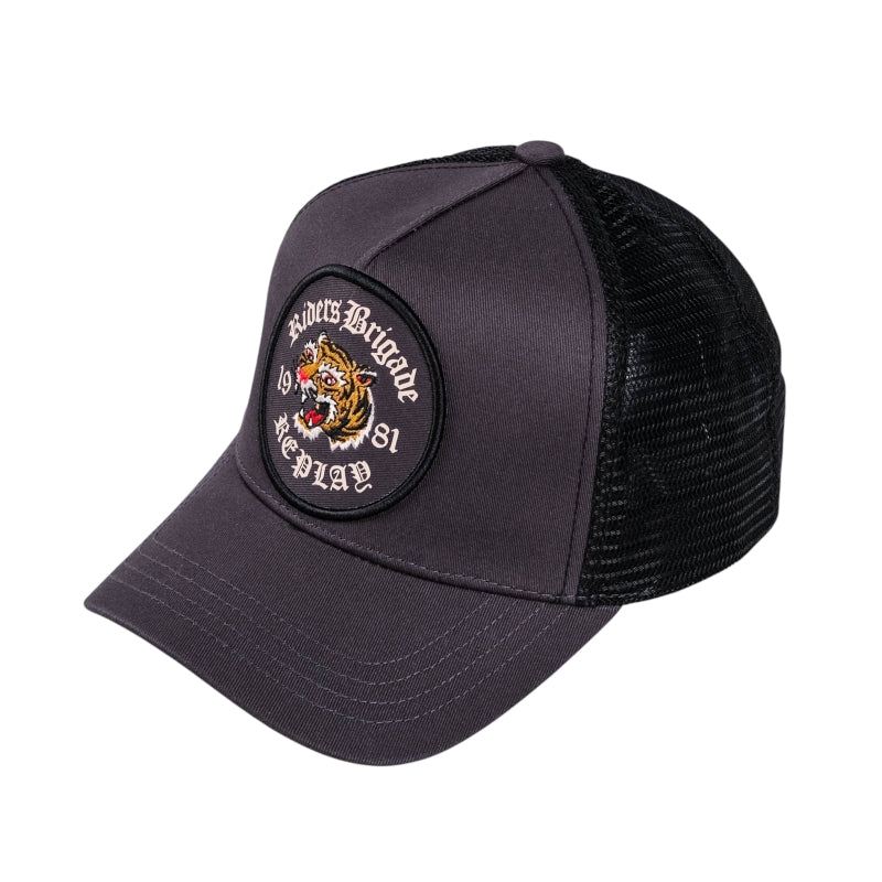 Replay Brigadeer Trucker Hat delivers bold street style with a statement tiger badge on the front. Mesh back panels keep airflow high for cool all day comfort. Adjustable snap closure gives a secure fit for everyday wear.