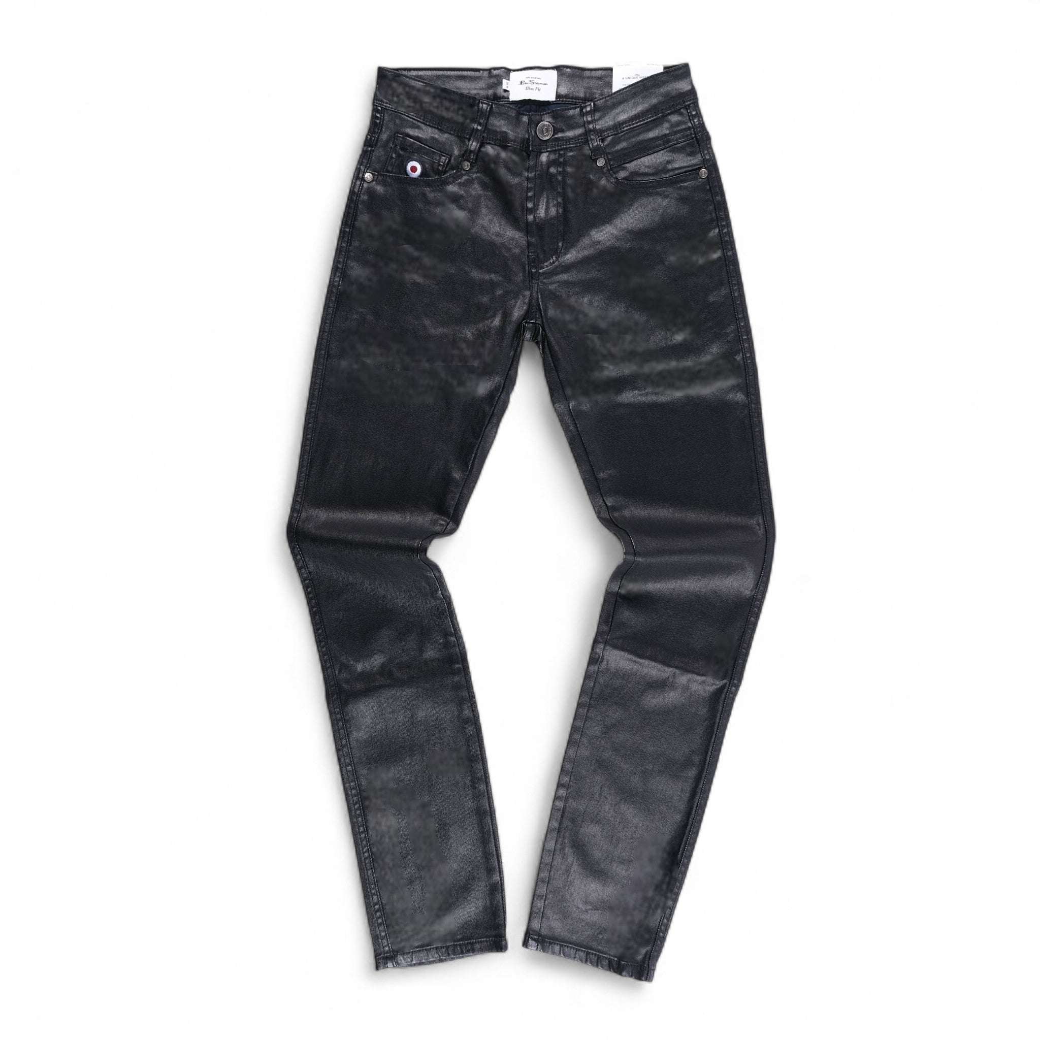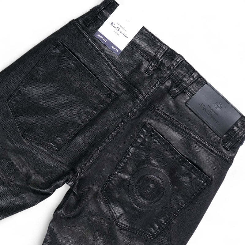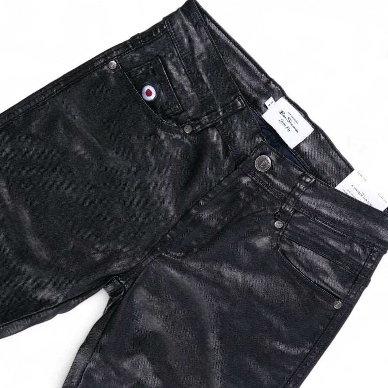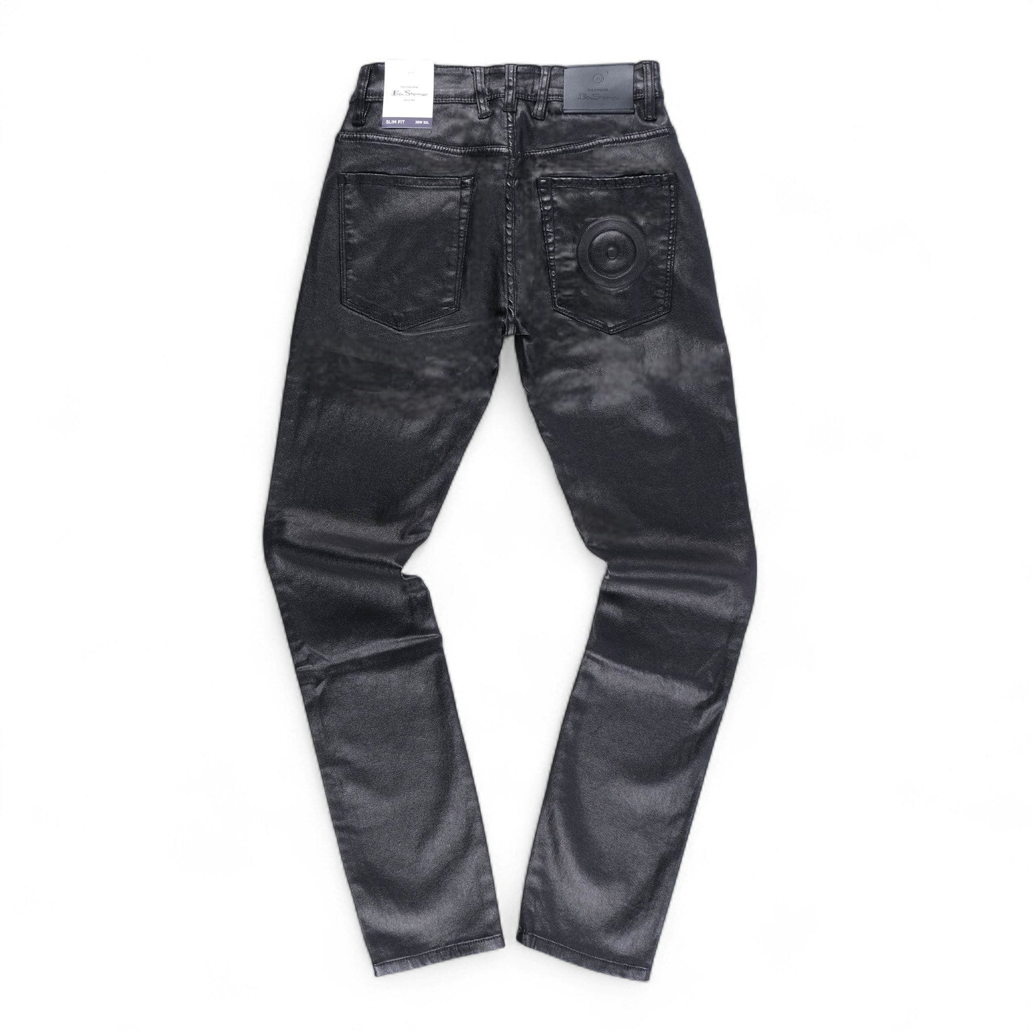 The Ben Sherman Wax Coated Sheen Slim Fit Jeans feature a sleek black finish that gives off a bold modern attitude. Their slim silhouette and coated texture create a refined edge perfect for a night out or elevated street style.