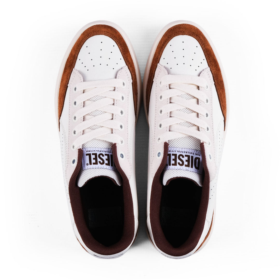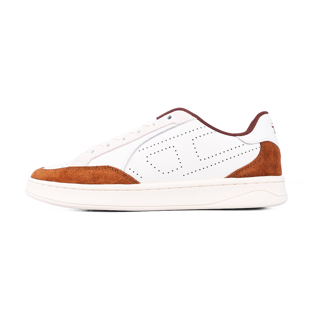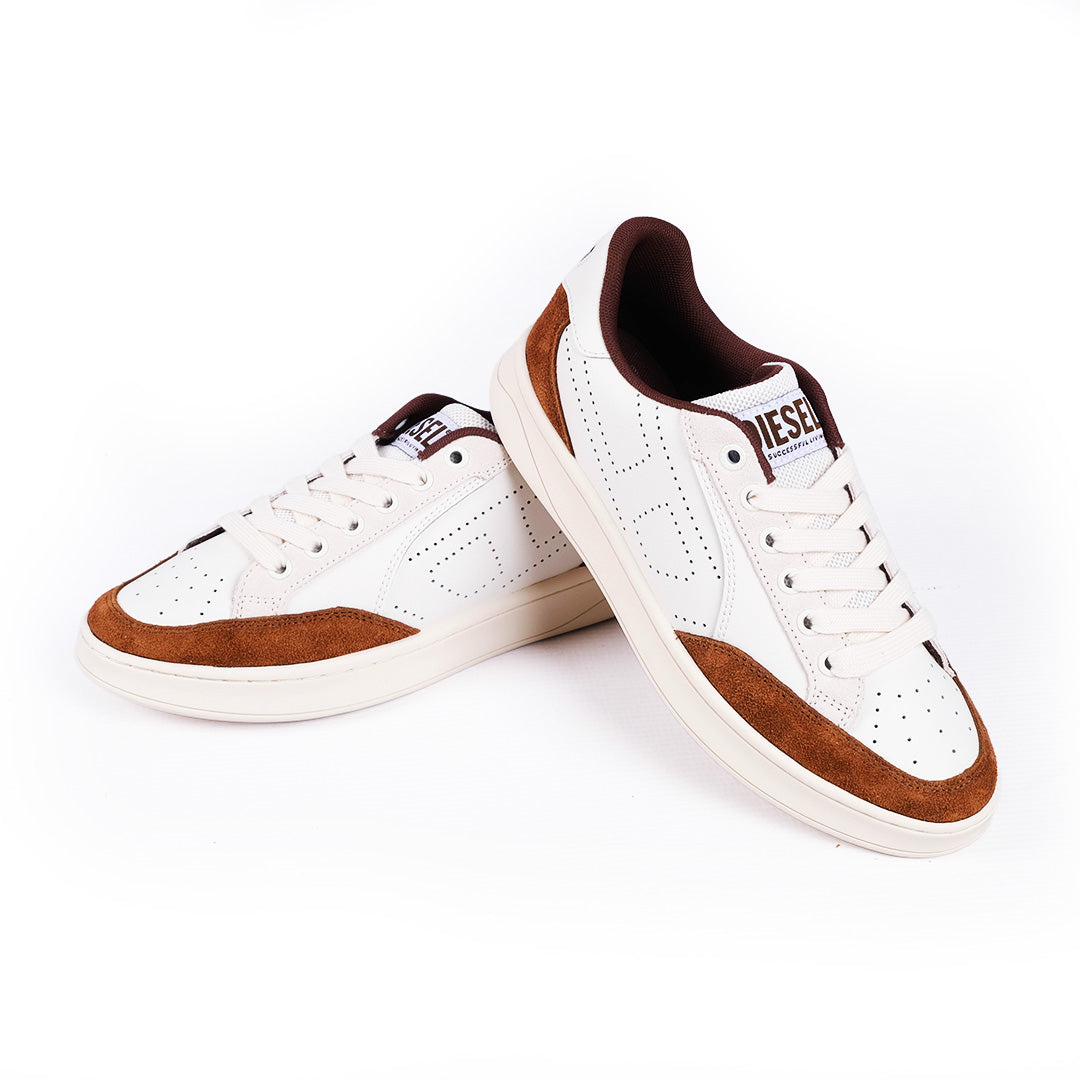 The Diesel S-Dakota Low Sneakers blend retro court style with modern street appeal. Featuring smooth white leather with rich tan suede overlays and bold perforated detailing they deliver a clean timeless look for everyday wear.