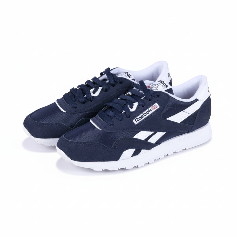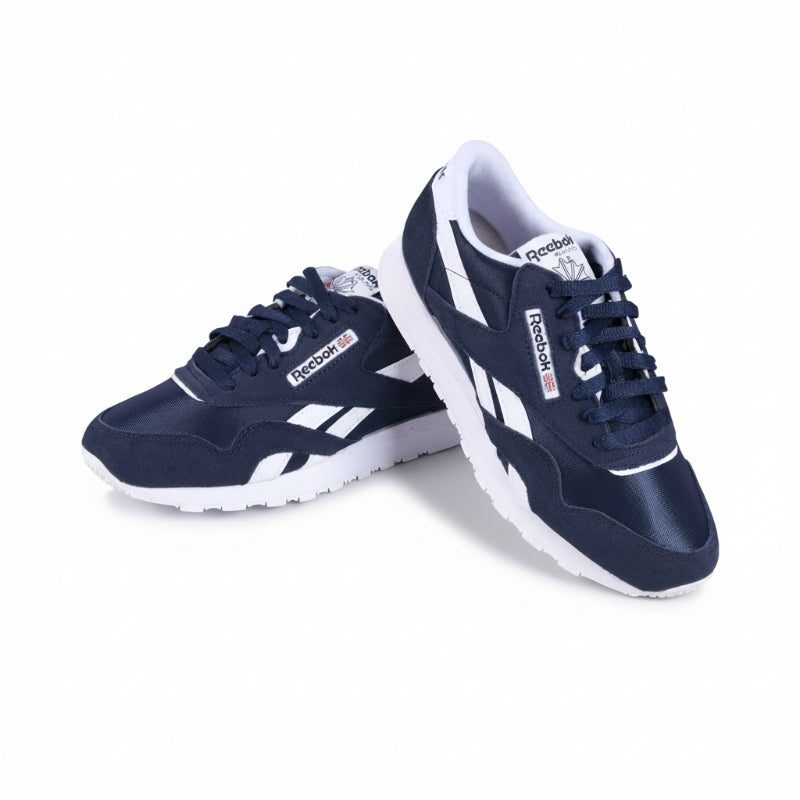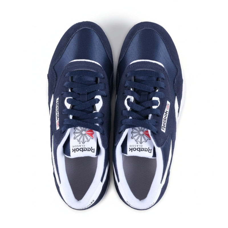 The Reebok Classic Nylon Sneakers combine vintage flair with modern comfort in a clean navy and white design. Their lightweight build and cushioned sole make them a stylish choice for everyday wear.
