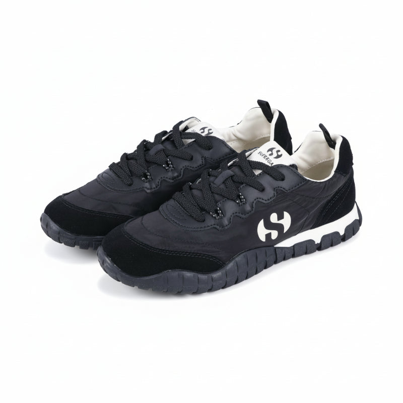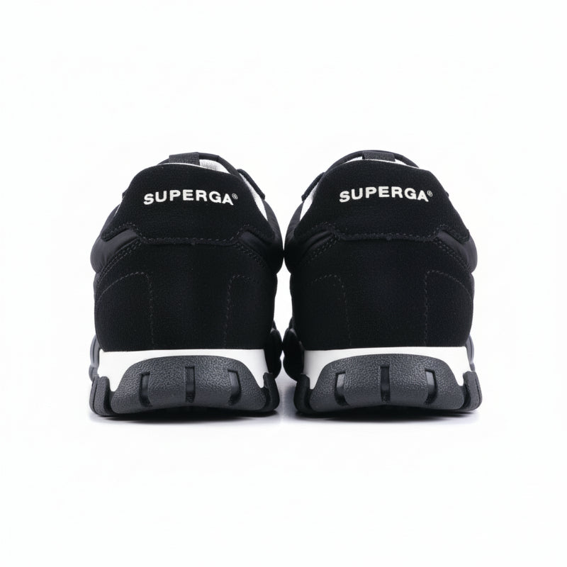 The Superga Juno Jogger Sneakers feature a sleek black design with bold white branding. Built with a chunky treaded sole and padded comfort lining they deliver sporty style and all-day wearability for the modern streetwear look.