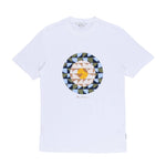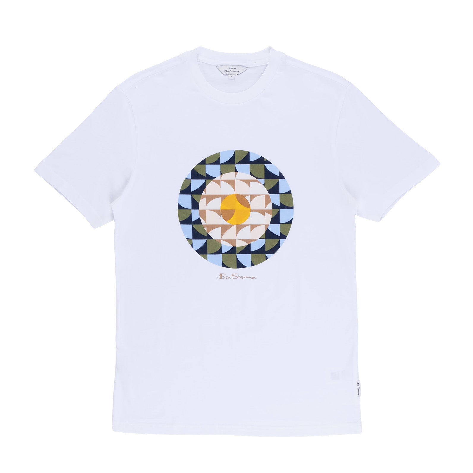 The Ben Sherman Geo Target Crew T-Shirt showcases a bold geometric circular print in earthy tones and cool blues on a crisp white base. Its clean silhouette and soft cotton fabric make it a standout piece for casual style with a modern edge.