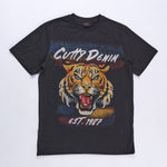 By Cutty Denim CoThe CUTTY Denim Co. Hogan T-Shirt in black is a fierce statement piece for any streetwear collection. Featuring a bold tiger decal on the front this tee embodies strength and confidence. Designed with a classic crew neck and short sleeves it offers a comfortable fit and effortless style.